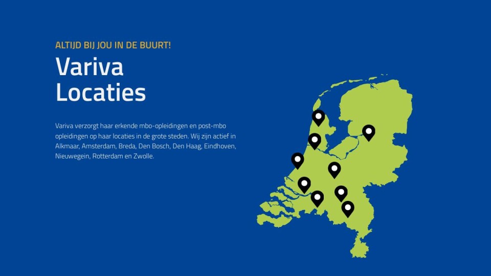 Variva verzorgt haar erkende mbo-opleidingen en post-mbo opleidingen op haar locaties in de grote steden. Wij zijn actief in Alkmaar, Amsterdam, Breda, Den Bosch, Den Haag, Eindhoven, Nieuwegein, Rotterdam en Zwolle.